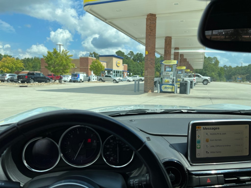 About halfway through the trip my low tire pressure light came on. My first reaction was “What did I run over?”. I don’t remember hitting anything or running over anything suspect and the car was driving fine. However, I still wanted to check and I was currently on a state road with nowhere to safely pull off. I carried on. I came to a small town and felt some relief that there would be a gas station to stop at and check my tires. My luck, however, proved otherwise. It would seem that the section of road I was on was residential only. About 15 miles later I did encounter another town with a gas station that seemed safe enough, so I pull in. None of my tires were obviously low and I didn’t have a tire pressure gauge on me, at least not one that worked, so I didn’t know which tire would be low. The gauge on my pump was wildly inaccurate. I didn’t want to be stopped long as I was having fun on my drive so I added air to all four tires. Just about 60 seconds of air or so each so I knew that they all got some extra air. At this point I forgot that the car has a tire light reset button so when I got back in and it was still on, I gave a light sigh. But again, the tires did not look low, and they all just got a quick injection of air so I got on with my journey.