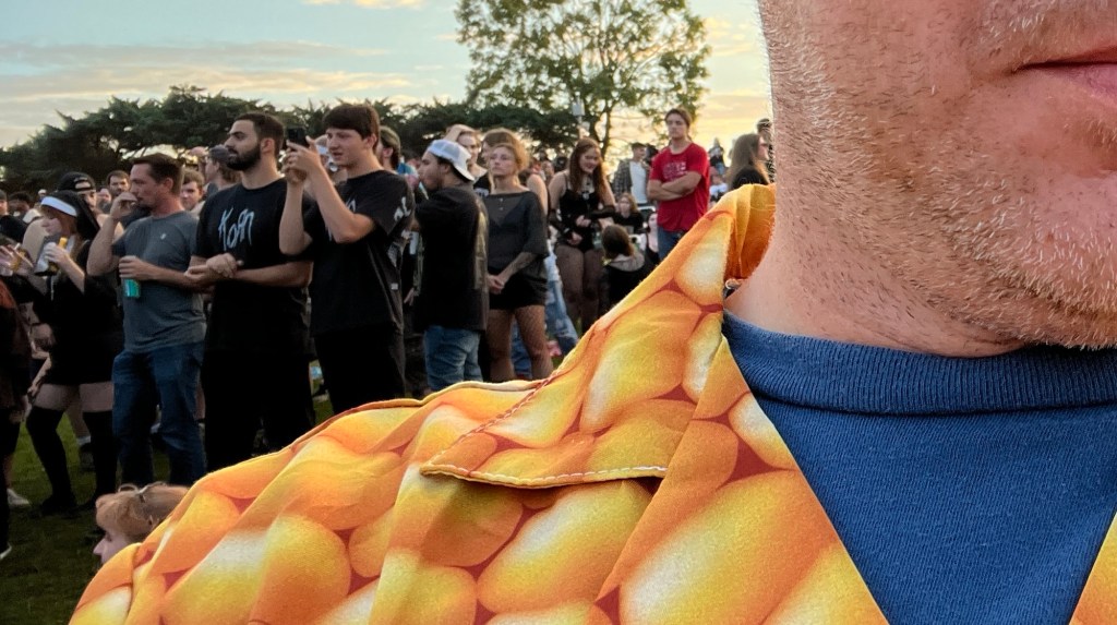 We bought lawn tickets as they were cheap and we planned this trip on a bit of a whim. We got there early enough though to be able to find some really close seats, and by “seats” I mean a close patch of grass. But it was our grass. As we were there to see KoRn we decided to get festive and wear corn related gear. One of the guys I was with also brought and actual ear of corn. This proved to be very popular, we had people asking us to pose with them and take our picture all night. I can’t tell you how many people have a picture of me and I have no idea who they are.