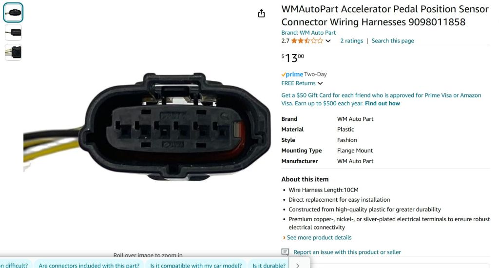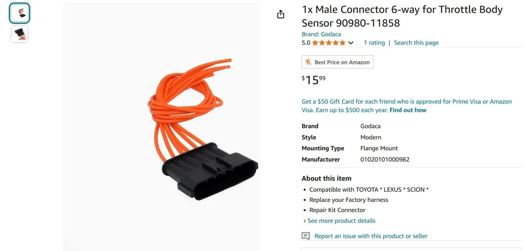 An hour or so of searching online told me that the connectors should be direct replacements. Meaning, I don’t have to worry about mixing up wires, as long as the connectors are in the same orientation such as both being clip side up. Its a direct 1 to 1 connection. So I hastily made a quick prototype connector, just twisting and taping the two connectors I had together. I fired the car up and….it worked. The car fired up, idled smooth and the throttle worked like it should. Success!