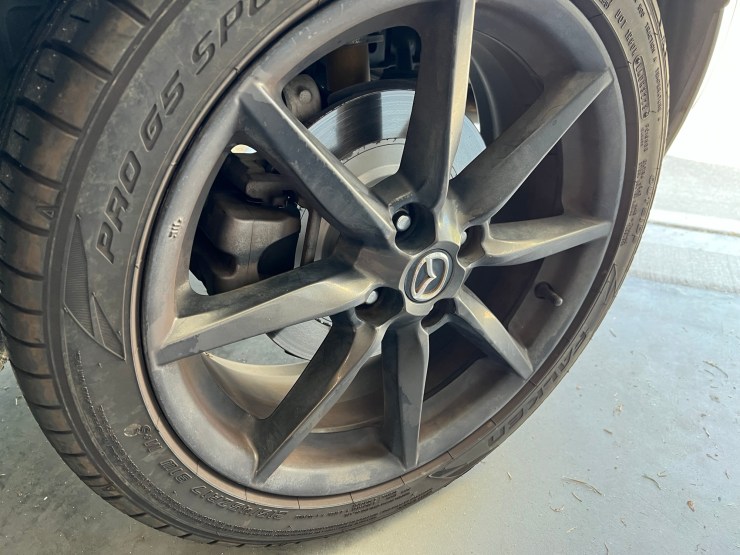 Was it the wheel bearing? The loose axle nut? Probably a combination of the two. But now both parts are new, as well as the rear brake rotors and pads. The car is quiet and drives very smoothly. With that fixed, it’s time I turn to attention to one of the last issues I need to fix that the previous owner gave me. The spray-painted wheels.