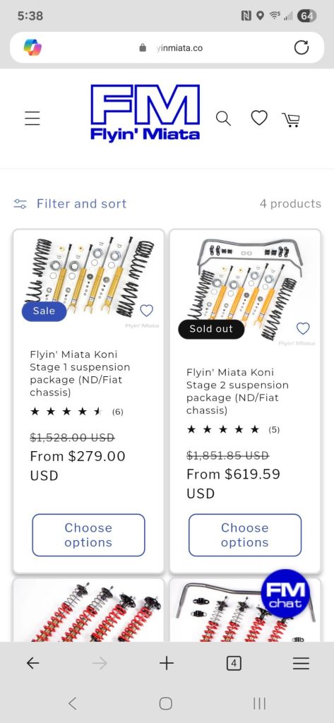 You are seeing that right. The Stage 1 setup was on sale for $279. That’s the set of springs and four adjustable Koni shocks. I immediately bought it, got my confirmation and was thrilled at the price they were at. It seemed way too cheap but then I remember a video recently where they mentioned they were developing a new suspension for the ND platform, so I thought they were blowing these out. As it was tagged “Sale” it seemed like a conscious decision.