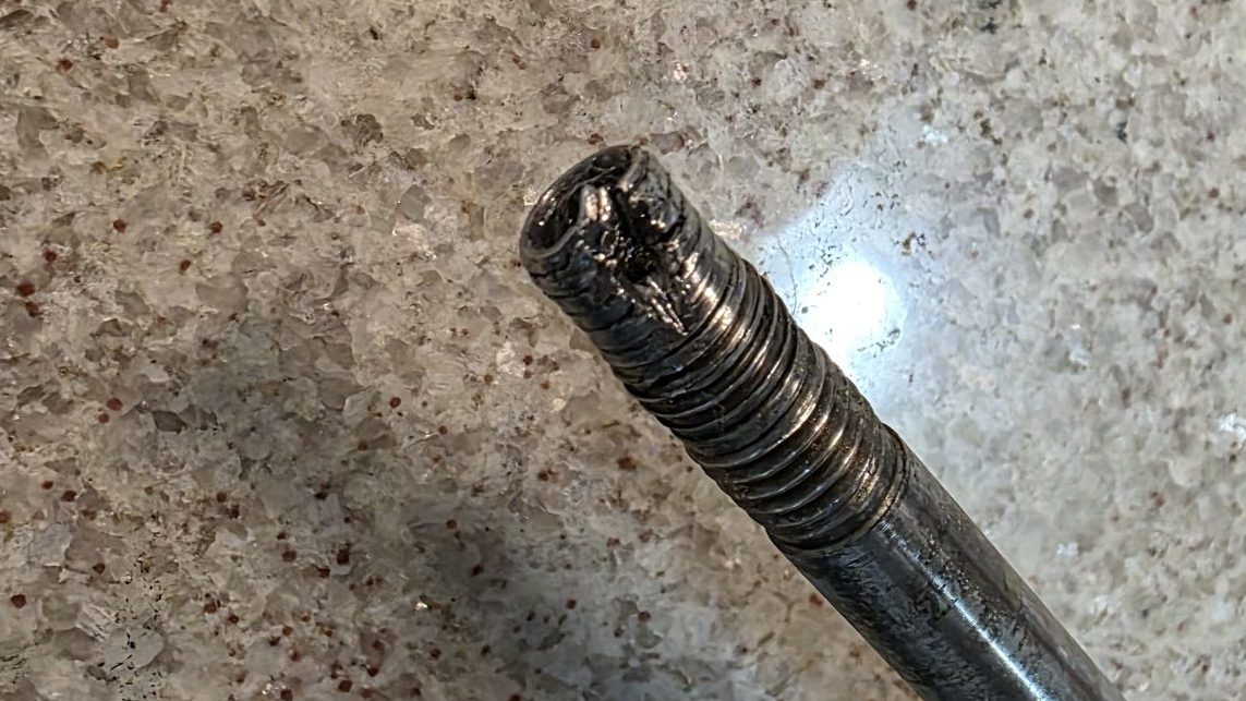 The crack did not extend down into where the nut was threaded and it was on tight, but I didn’t feel safe leaving it so I removed the assembly and begain trying to remove the top nut. The split did not allow me to hold the shaft steady with an allen wrench like you’re supposed to do. Going on was not an issue which is probably why I didn’t notice, but now the split kept opening and not allowing the wrench to bite. So I had to resort to using vice grips on it to break the nut loose.
