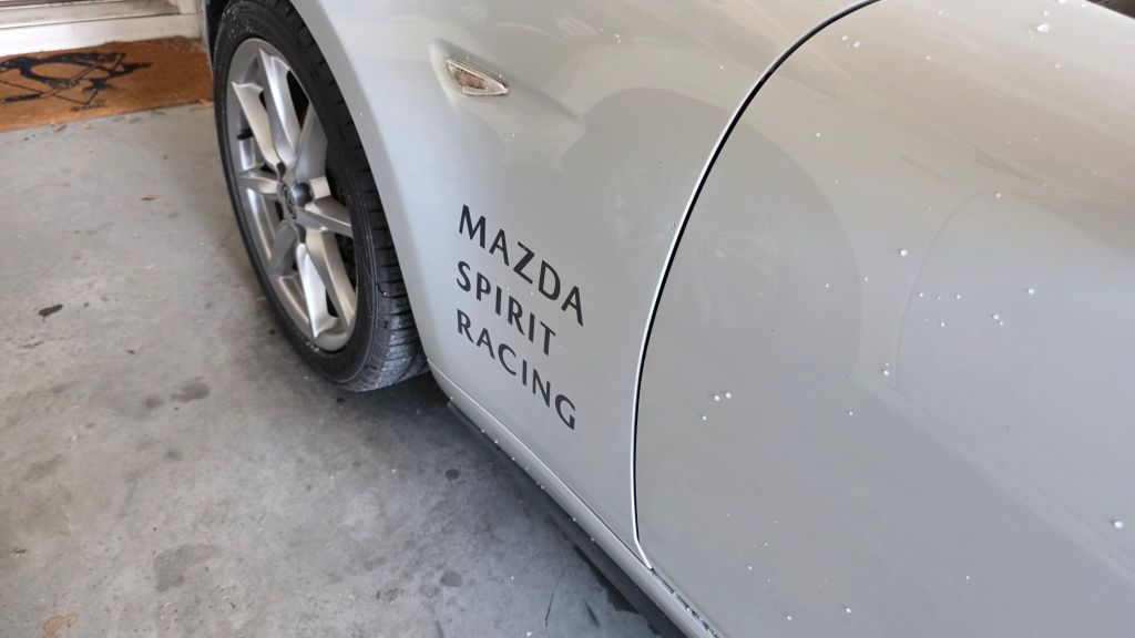 Next I want to spice up the exterior just a little for the upcoming event. Nothing extravagant but a small touch to be festive. I settled on replica Mazda Spirit Racing graphics. I did the side ones and the hood stripe. I loved the look when I saw pictures, but in person I felt the hood stripe was a little too “busy” looking so I removed it and just went with the side decals. I also added an old school “Mazda” logo to the grill, as a nod to 1.6L Miatas that started it all.