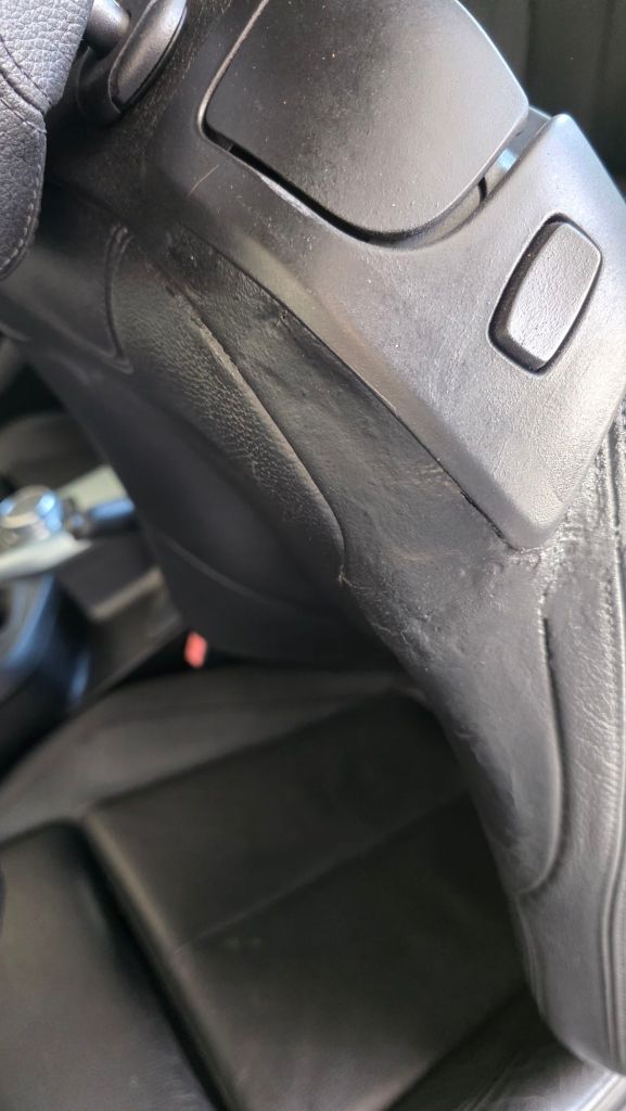 The back cushions on the rear seats were also worn. The driver side one was split at a seam and they used a clear glue to fix it. Not only was the repair work badly done, but you could still see the split through the clear glue. The driver seat where the handle is to flip the seat forward for rear access also had a very poor leather repair.